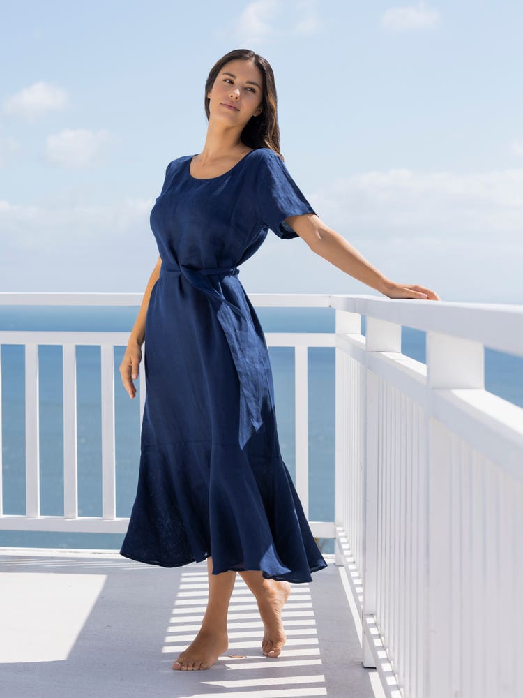 Lady Maxi elegantna lanena obleka z dolgimi rokavi